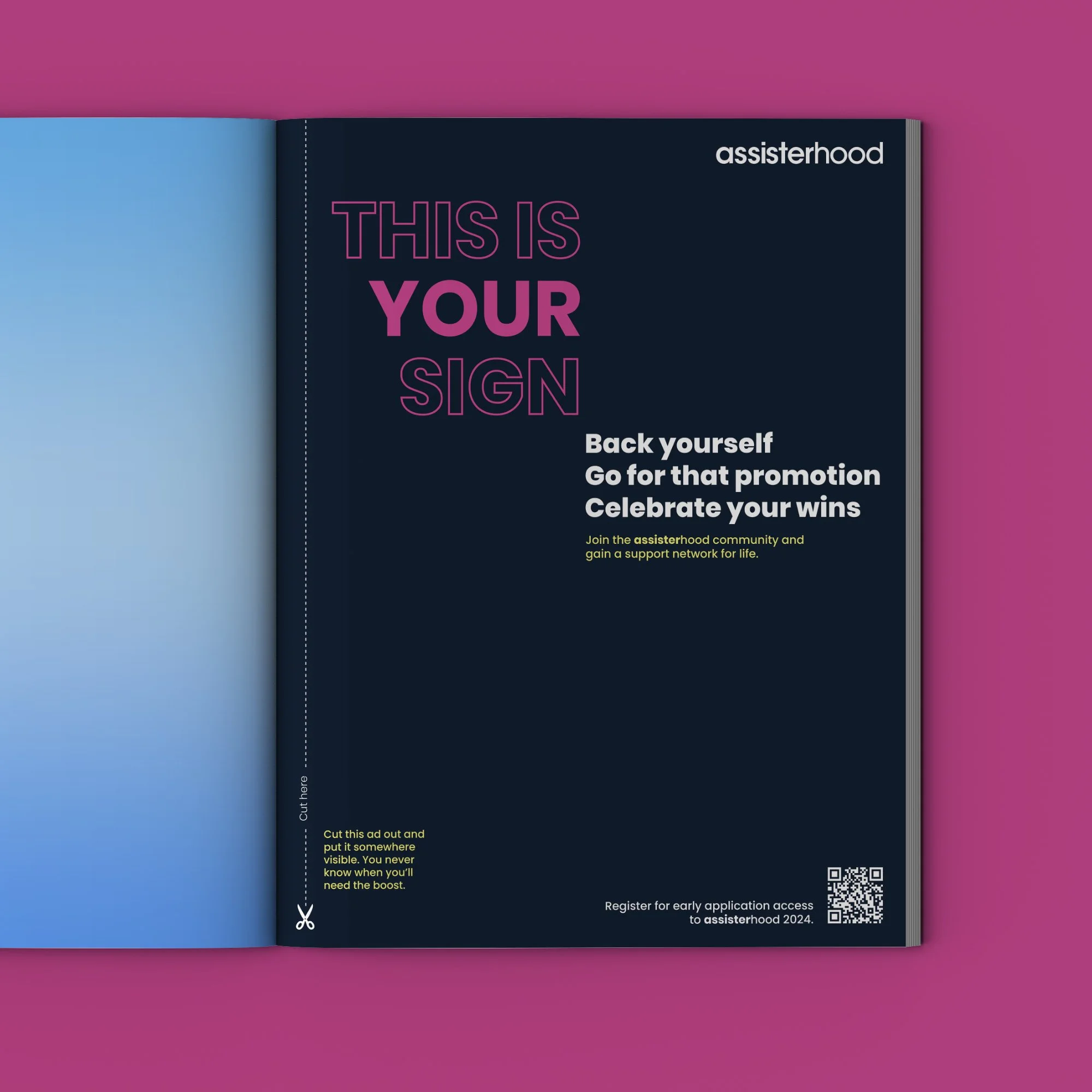 Within Vol 2. sits our Assisterhood press ad if you can call it that. Instead of a direct call to apply for the program, we decided to dedicate the space to a sign for female empowerment. The spot encouraged the viewer to interact by including a ‘cut here’ line.